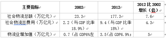 这十年,社会物流总值、社会物流总费用、物流增加值的增长速度都在20%左右,大大超过了GDP的增长速度,由于经济的高速发展,中国处于工业化中后期,城市化加速,新农村建设,进出口贸易加码,使物流的需求量大增,这十年,是数量扩张型的十年。