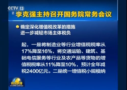 3月28日,国务院召开常务会议决定,从2018年5月1日起,将制造业等行业增值税税率从17%降至16%,将交通运输、建筑、基础电信服务等行业及农产品等货物的增值税税率从11%降至10%,预计全年可减税2400亿元。