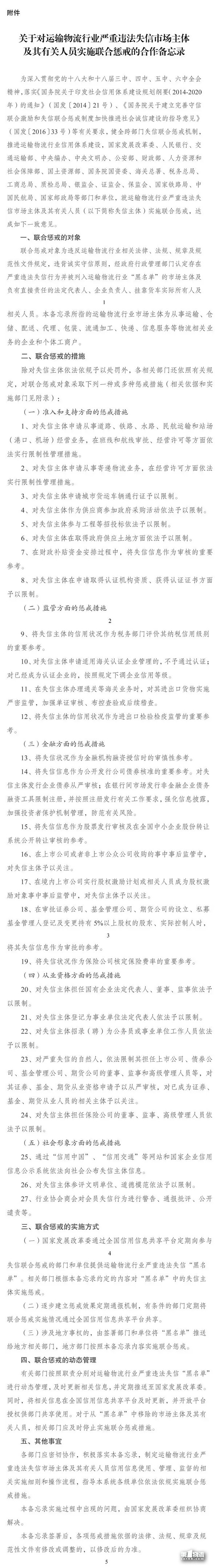 近日,国家发改委等20个部门联合签署了《关于对运输物流行业严重违法失信市场主体及其有关人员实施联合惩戒的合作备忘录》(以下简称《合作备忘录》)。