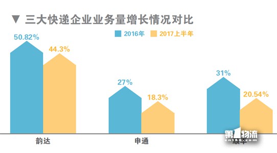 根据顺丰发布的财报显示,2017年上半年,顺丰控股实现快件业务量13.73亿件,同比增长20.54%;2016年顺丰快件业务量为25.8亿件,同比增长31%。而申通快递2017年半年业务量为17.26亿件,同比增长18.3%;2016年业务量近32.6亿件,同比增长约27%。此外,韵达2017年上半年财报数据也显示,业务量同比增长44.28%;相比2016年公司业务量50.82%的增幅有所减缓。