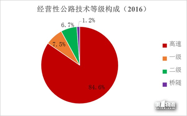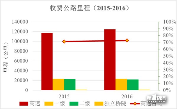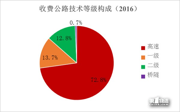 截至2016年底,全国收费公路里程为17.11万公里,占公路总里程469.63万公里的3.6%。其中,高速公路12.45万公里,一级公路2.35万公里,二级公路2.19万公里,独立桥梁隧道1123公里,分别占收费公路总里程的72.8%、13.7%、12.8%和0.7%。