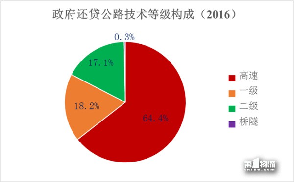 截至2016年底,全国政府还贷公路里程10.05万公里,占全国收费公路里程的58.7%。其中,政府还贷高速公路6.47万公里,一级公路1.83万公里,二级公路1.72万公里,独立桥梁隧道286公里,分别占政府还贷公路里程的64.4%、18.2%、17.1%和0.3%。政府还贷高速公路占收费高速公路里程的52.0%。