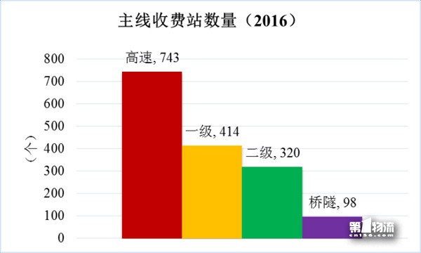 截至2016年底,全国收费公路共设主线收费站1575个(省界联合设置的收费站,每省按照0.5个计算,下同)。其中,高速公路743个,一级公路414个,二级公路320个,独立桥梁隧道98个,分别占主线收费站数量的47.2%、26.3%、20.3%和6.2%。