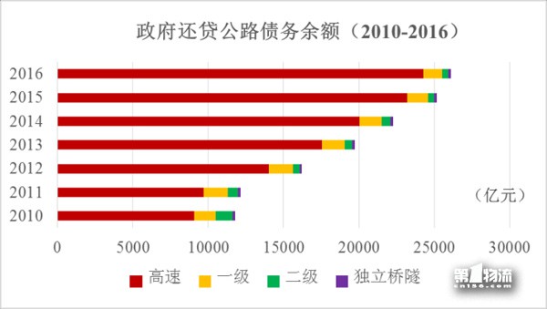 截至2016年底,政府还贷公路债务余额26107.5亿元,占全国收费公路债务余额的53.8%。其中,政府还贷高速公路债务余额24248.7亿元,一级公路1264.6 亿元,二级公路394.9 亿元,独立桥梁隧道199.3亿元,分别占年末债务余额的92.9%、4.8%、1.5%和0.8%。