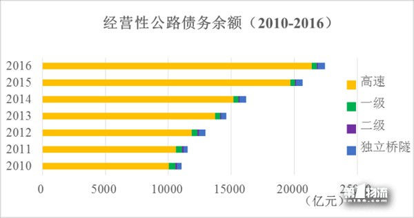 截至2016年底,全国收费公路债务余额为48554.7亿元。其中,高速公路45635.0亿元,一级公路1673.8 亿元,二级公路468.9 亿元,独立桥隧777.0亿元,分别占全国收费公路债务余额的94.0%、3.4%、1.0%和1.6%。