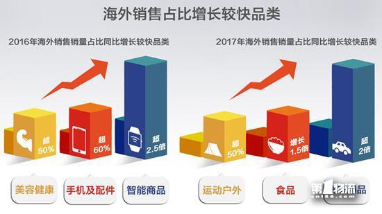 2017年,海外销售销量占比增长最快的品类:汽车用品,同比增长超过2倍;食品,同比增长近1.5倍;运动户外,同比增长超过50%;