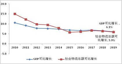 2010-2019年社会物流总额与GDP可比增长对比(单位:%)