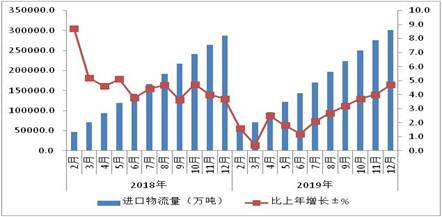 全球产业链地位继续巩固,进口物流量质齐升。2019年我国货物贸易规模迈上新台阶,全年货物进出口总额31.5万亿元,增长3.4%,出口占国际市场份额稳步提升,根据世界贸易组织统计,2019年前三季度我国出口增速比全球高2.8个百分点,国际市场份额比2018年提高0.3个百分点至13.1%。在此背景下,我国全球产业链的地位继续巩固,进口物流需求形势总体良好,逐季回升,特别是12月进口总值更是创下月度历史峰值。海关数据显示,部分原材料和能源产品进口持续增加。2019年,我国进口铁矿砂10.7亿吨,增长0.5%;进口原油5.06亿吨,增长9.5%;进口天然气9656万吨,增长6.9%;进口大豆8851万吨,增长0.5%。此外,消费品、医药品进口分别增长19%和25.8%。