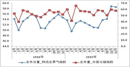 2018-2019年物流业景气指数、中国仓储指数业务量指数走势