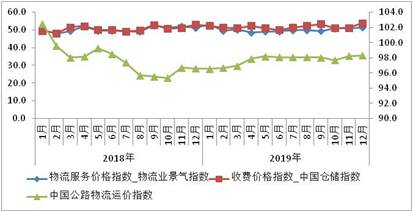 2018-2019年物流业景气指数、中国仓储指数、中国公路物流价格指数走势