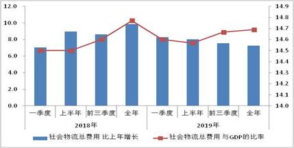 2019年社会物流总费用比上年增长7.3%,增速比上年回落2.5个百分点,比年初回落1.2个百分点。社会物流总费用与GDP的比率为14.7%,比上年同期下降0.1个百分点。其中,运输物流效率持续改善。物流运输系统更为高效,铁路、管道运输费用占比均有提高,相对费率较高的道路运输比率有所下降,显示当前运输费用结构更趋合理。各种交通方式向一体化融合发展转变,运输结构进一步优化,铁水、公铁、公水、空陆等联运发展迅速,多式联运及运输代理等高效连接方式占比提高1.1个百分点。