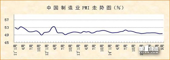 中国物流与采购联合会、国家统计局服务业调查中心发布的2015年9月份中国制造业采购经理指数(PMI)为49.8%,较上月上升0.1个百分点。该指数最近4个月以来首次出现小幅回升。12个分项指数中,只有5个指数略有下降,其余均有所上扬,特别是新订单指数上升较为明显,站上50%扩张和收缩的分界线。综合来看,制造业PMI指数弱势表现有改变,走势企稳回升,显示淡季影响衰减,稳增长政策措施效应进一步显现,经济运行呈现缓中趋稳积极变化。