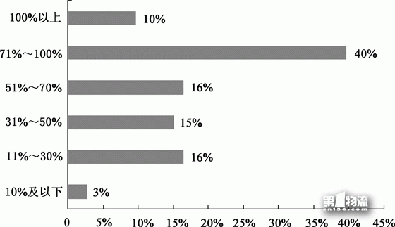 调查结果显示,我国物流园区平均实际投资额为109亿元,规划投资额完成率在71%~100%占园区总数的40%。实际投资超出规划投资的物流园区占园区总数的10%。经分析,规划投资额完成率超过100%的园区规模普遍偏小,平均规划投资额为6亿元,而平均实际投资额为8亿元。与此相反,规划投资额超过70亿元的大型物流园区,平均实际投资额为48亿元,完成率为49%,总体尚未完成规划投资目标。上述情况表明,我国物流园区投资规划的科学性、合理性有待进一步提高,如图2所示。