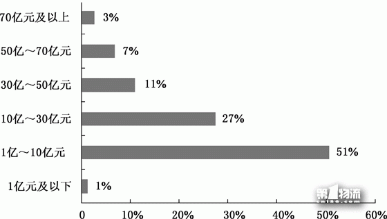 物流园区平均规划投资额为201亿元。其中,投资1亿~10亿元的物流园区占51%;10亿~30亿元的物流园区占27%。如图1所示。