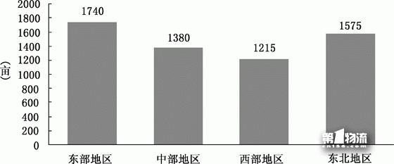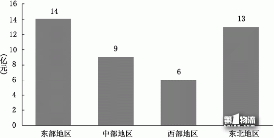 据调查,我国东部地区物流园区平均实际投资额在全国最高,为14亿元;其次为东北地区13亿元;物流园区投资规模最小的为西部地区,平均实际投资额仅为6亿元。具体情况如图3所示。