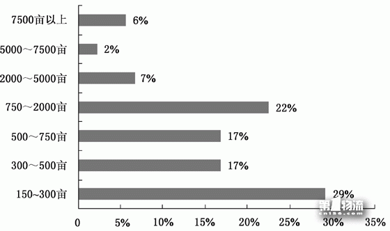 物流园区服务规范及评估指标》(GB/T 30334—2013)(以下简称《规范》),建议物流园区占地面积不小于0.5平方公里(750亩)以上。从本次统计来看,实际占地面积在150~750亩的物流园区占63%,与《规范》建议的占地面积标准相差较大;另外,占地7500亩以上的超大型园区占6%,如图5所示。