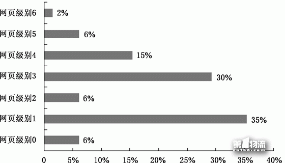 据调查统计,目前我国仅有65%的物流园区具有自己的网页,物流园区对自身网站建设的重视程度有待提高。在物流园区评价中,我们选取网页级别作为衡量园区网站建设水平和服务能力的度量指标。网页级别(PR值)是当前国际上流行的用来标识网页等级和重要性的指标。级别从0到10级,10级为满分,PR值越高说明该网页越受欢迎(越重要)。通过利用专用工具对各物流园区网页级别查询并统计,可以看出网页级别为1的物流园区占35%,网页级别为3的占30%,而网页级别为6的仅占2%。目前,我国物流园区PR值尚无超过6的高水平网页,相反,却有6%的物流园区网页PR值为0,具体分布情况如图14所示。