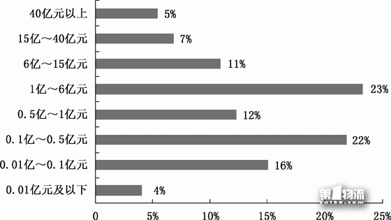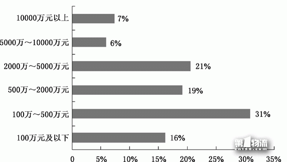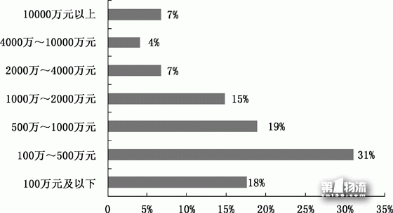 物流园区公共信息平台投入占园区实际投资的比例平均为7.9%,而园区软件系统投入占公共信息平台投入的比例平均为54.6%。物流园区公共信息平台投入规模分布情况如图13所示。