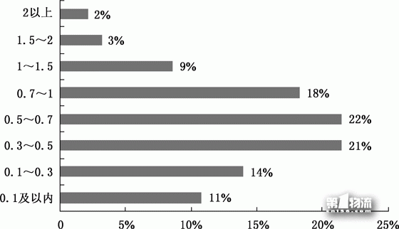 物流园区容积率是指物流园区的总建筑面积与占地面积之比。根据每个园区的容积率,测算出我国物流园区的平均容积率为0.67,具体分布情况如图9所示。
