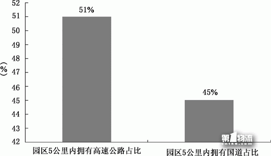物流园区与高速公路的出入口距离在5公里以内,平均距离为2.25公里;45%的园区与国道的距离在5公里以内,平均距离为166公里。可见,园区周边的公路便利性总体较好。具体如图11所示。