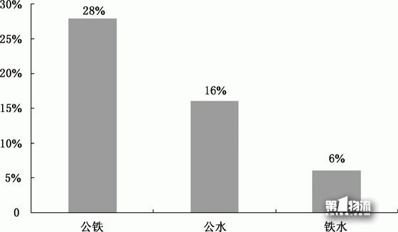 本报告对物流园区具备多式联运条件进行规定,5公里内具有铁路货运场站、港口以及机场设施的物流园区认为具有多式联运能力。根据统计,物流园区5公里内能够进行公铁联运、公水联运、铁水联运的园区比例,可知,5公里内能够实现公铁联运的物流园区占到了28%,具体如图12所示。