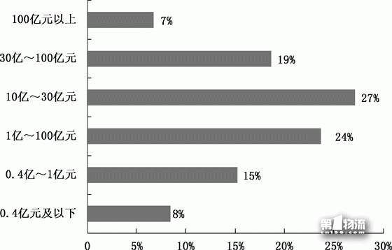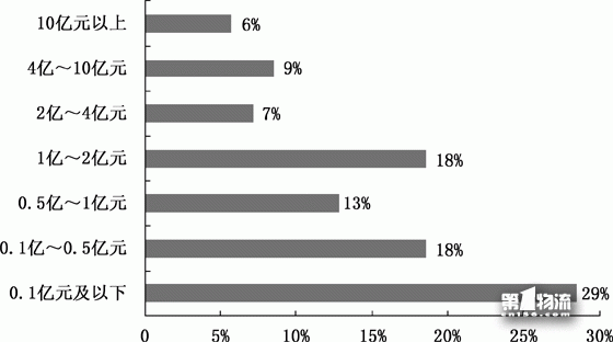 根据统计结果,2014年我国物流园区入驻企业平均营业收入为264亿元,其中有26%的物流园区入驻企业营业收入在30亿元以上,详细分布情况如图20所示。