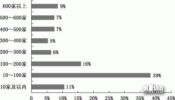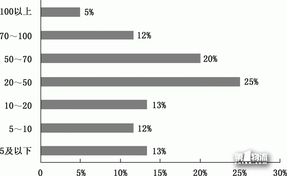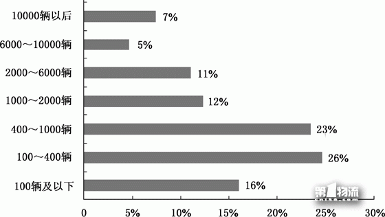物流园区平均自有车辆为368辆,平均整合社会车辆10939辆,图16是我国物流园区货运车辆规模分布情况。