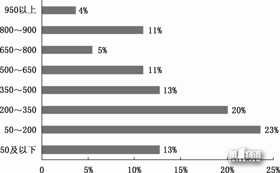 就业规模指园区管理机构人数与入驻企业中从事物流活动的就业人数之和。根据本次统计,2014年我国物流园区平均就业人数为5900人,具体分布如图22所示。