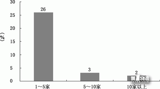 调查统计发现,我国 物流园区有世界500强企业入驻的仅为31%,平均入驻数量为1家,入驻世界500强企业数量在5家之内的占统计总数的26%;入驻世界500强企业数量在10家以上的仅占2%。具体分布情况如图30所示。