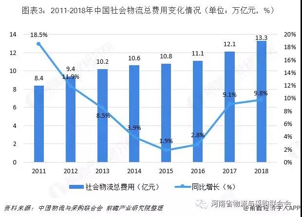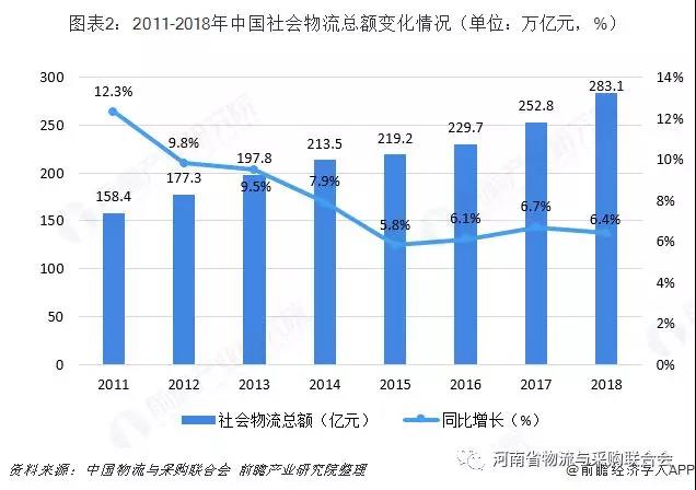 据中国物流与采购联合会统计显示,2018全年社会物流总额为283.1万亿元,按可比价格计算,同比增长6.4%。且下半年增速明显低于上半年,需求规模保持适度增长,增长压力有所加大。